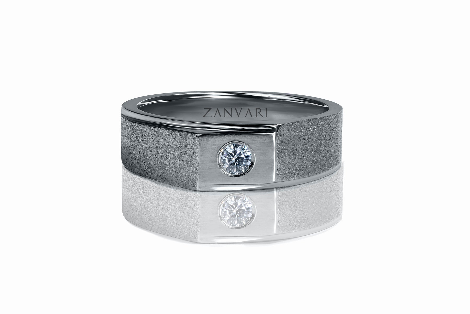 Silver ring with a diamond on a white background, featuring the brand 'Zanvari'.