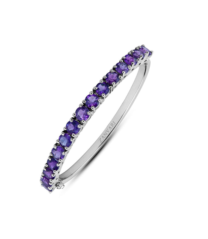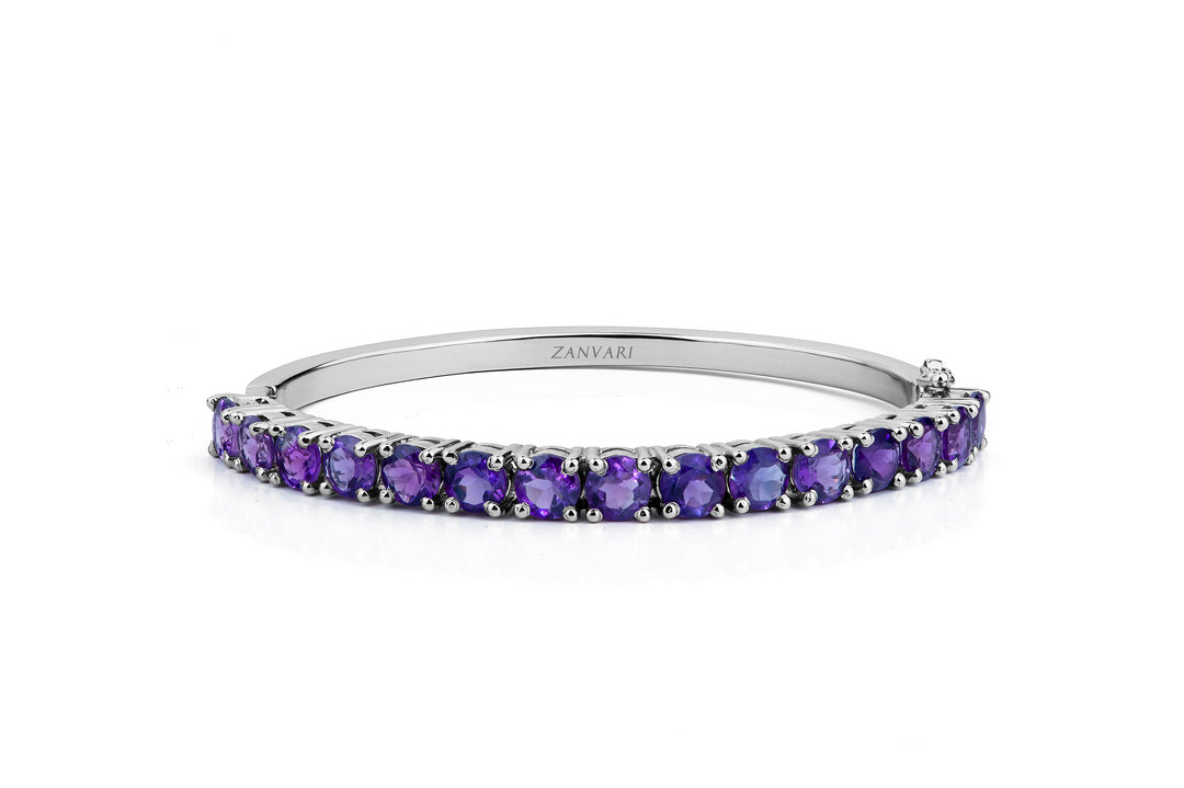 Set in a 925 sterling silver band, the bangle radiates luxury and charm. The rich purple of the amethyst is beautifully complemented by the lustrous white gold plating, creating a harmonious balance between modern refinement and classic sophistication. Each gemstone shines with a brilliance that captures the essence of elegance and grace.